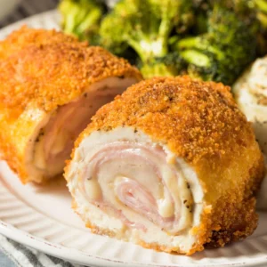 Juicy chicken breast layered with ham and melted cheese, lightly…